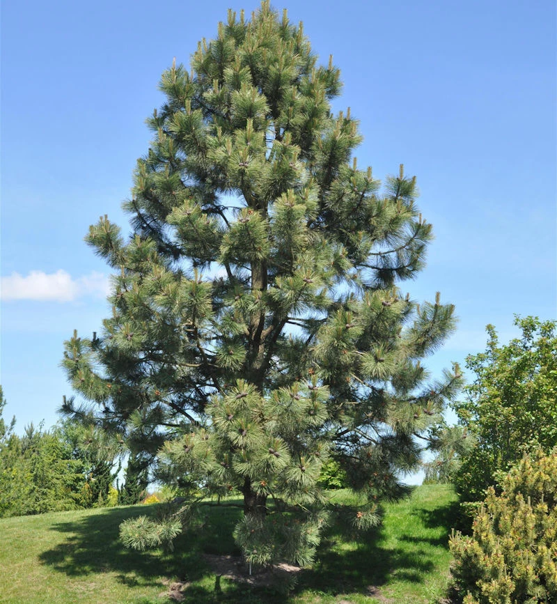 Zugegeben, bis sie Ihre Endhöhe erreicht hat können unzählige Jahre vergehen, aber so einen Baum pflanzt man ja auch irgendwie für die Ur-Ur-Ur-Enkel 😉 Die Pinus ponderosa Ist absolut robust und tolerant. Weder Hitze noch Frost können ihr etwas anhaben. Dem Standort gegenüber sind sie relativ tolerant. Die Gelb-Kiefer benötigt ausreichen Sonne und auf Staunässe müssen Sie aufpassen, diese muss vermieden werden. Die Pinus ponderosa hat so viele deutsche Namen. Sie wird auch Ponderosa-Kiefer, Gold-Kiefer oder Dreinadelige Kiefer genannt. Überraschender Weise hat die Gelb-Kiefer überwiegend dunklgrüne Nadeln. Das Holz mag ihre diesen Namen gegeben haben. Der Stamm kann nach einem Jahrhundert und vielleicht auch mehr, einen Durchmesser von 150cm erreichen. Das ist also keine Balkonpflanze. Die Pflanze benötigt einen humosen und gut durchlässigen Gartenboden. Sie sollte einen sonnigen bis halbschattigen Standort in ihrem Garten erhalten. Über winterhärte muss man hier wohl nicht informieren. In den 100 bis 200 Jahren hat die Pinus ponderosa viele Winter gesehen.