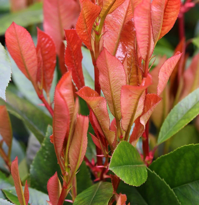 Die Glanzmispel Red Robin, botanisch Photinia fraseri Red Robin, ist mein persönliches Highlight als Heckenpflanze. Als prächtiger Strauch kann sie eine Wuchshöhe bis zu 3 Meter erreichen. Im Jahr ist mit einem Zuwachs von 50 cm zu rechnen. Die Glanzmispel Red Robin ist sehr gut schnittverträglich. Ihre immergrünen Blätter verfärben sich im Sommer kupfrig-grün. Sie bilden einen starken Kontrast zu den jungen blutroten Blättern. Diese Glanzmispel stellt keine besonderen Ansprüche an den Boden und wächst am liebsten an sonnigen bis absonnigen Standorten. Strauch, einsetzbar als Solitärpflanze, Formgehölz und als besonders attraktive Heckenpflanze.