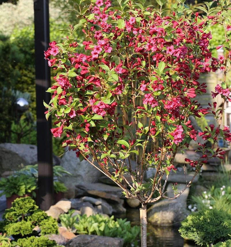 Die Weigelie Bristol Ruby wurde auf Hochstamm veredelt. Die Blüten sind glockenförmig und rubinrot. Sie ist eine sehr reichblühende Gartenpflanze. Beim beschneiden der Pflanze ist zu beachten, dass die Weigelie am jungen Holz des letzten Jahres blühen. An den Gartenboden stellt die Pflanze keine besonderen Ansprüche. Ihr Standort sollte sonnig bis halbschattig sein. Sie kann als Ziergehölz, als Solitärpflanze, aber auch als Heckenpflanze genutzt werden. Die Weigelie Victoria ist eine winterharte Gartenpflanze.